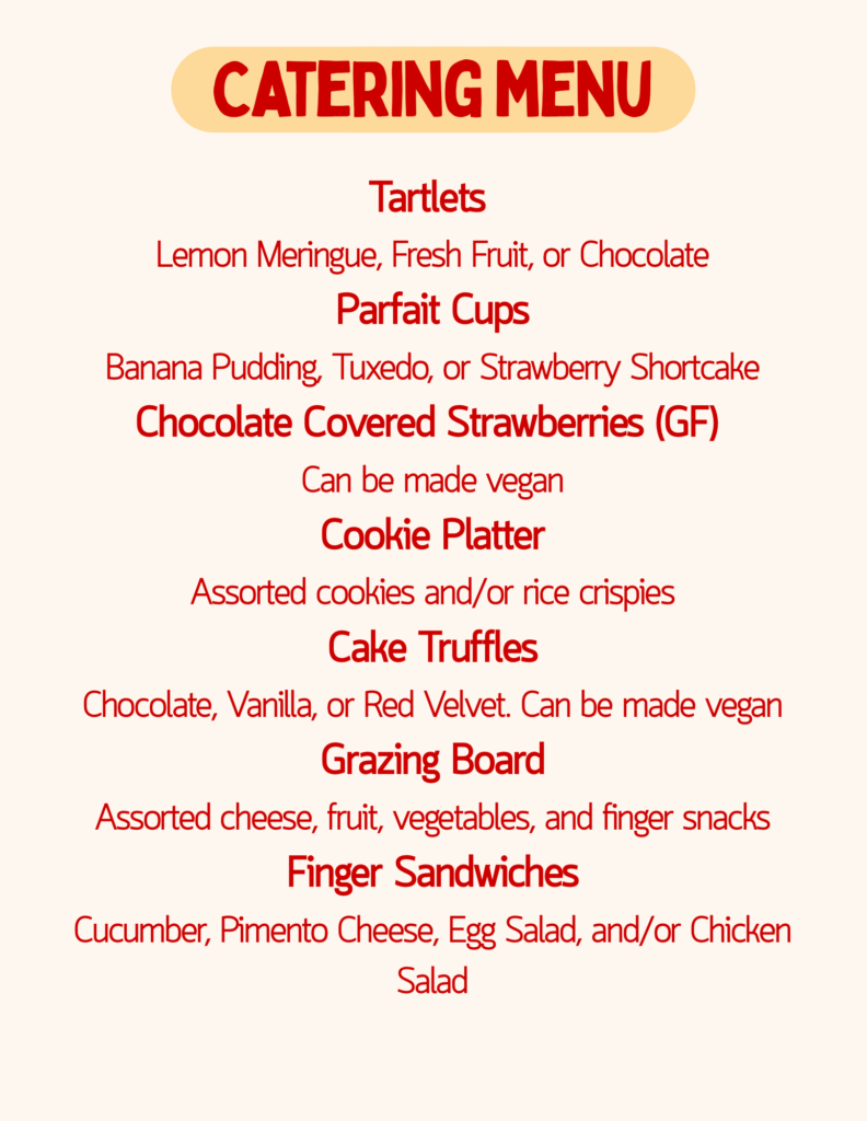 Looking to feed a crowd? I offer a wide variety of treats and snacks for events like birthday parties, bridal showers, baby showers, wedding receptions, and more. Even if you’re just looking for a box of sweets for the office, I can make that happen.